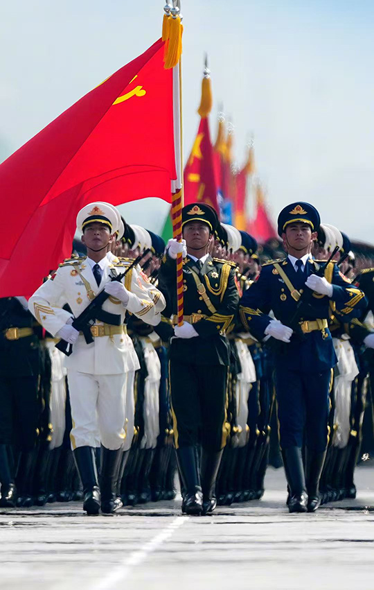בשעה 10:00, עם תחילת המצעד הצבאי, הושמע ההמנון הלאומי החגיגי, וכל המשתתפים קמו באופן ספונטני לחלוק כבוד. הצעדים המסודרים של תצורות הרגל, הציוד המתוחכם של עמודי החימוש ודרגי האוויר המלכותיים זעזעו את כולם עמוקות, והראו את השיפור בכוח ההגנה הלאומי של סין. הצגת 80 דגלי כבוד של יחידות גיבורי מלחמה אנטי-יפניים גרמה לאנשים להבין עד כמה הניצחון היה קשה.